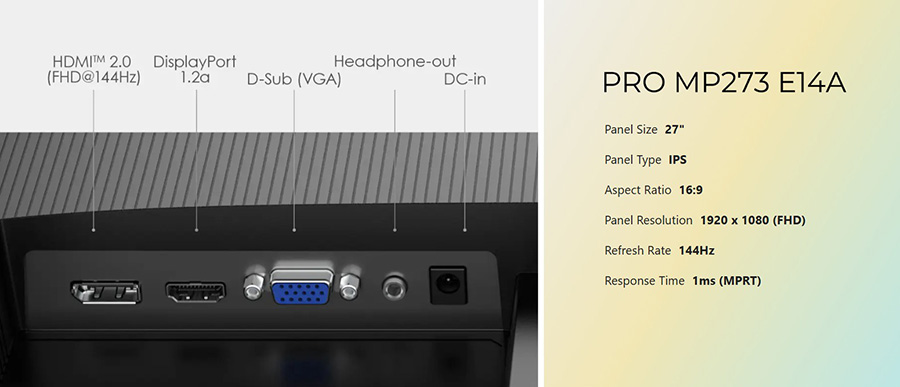 PRO MP273 E14A monitör 144Hz tazeleme hızı ve Adaptive-Sync özelliği ile akıcı bir oyun ve çalışma deneyimi sunar. Ergonomik tasarımı, PerfectEdge ekranı ve HDR Ready özelliği sayesinde hem göz konforu, hem de oyun kapsayıcılığı açısından mükemmel bir çözümdür.
